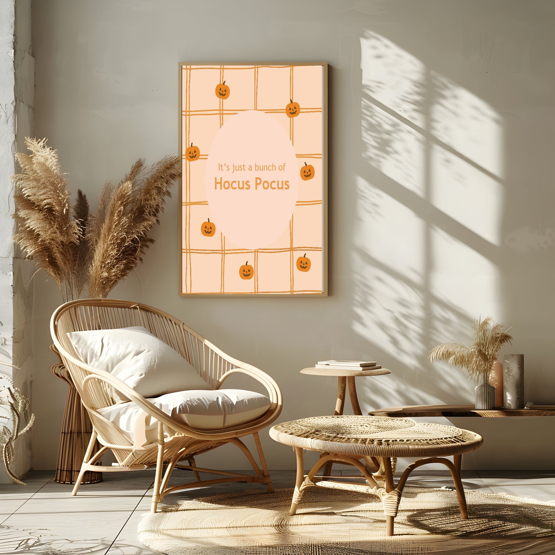Add a playful Halloween vibe with the It’s Just a Bunch of Hocus Pocus Print, featuring a fun pumpkin pattern on a checkered orange background. Perfect for bedrooms, living rooms, or seasonal party décor, this whimsical print brings festive charm and spooky fun to your home.