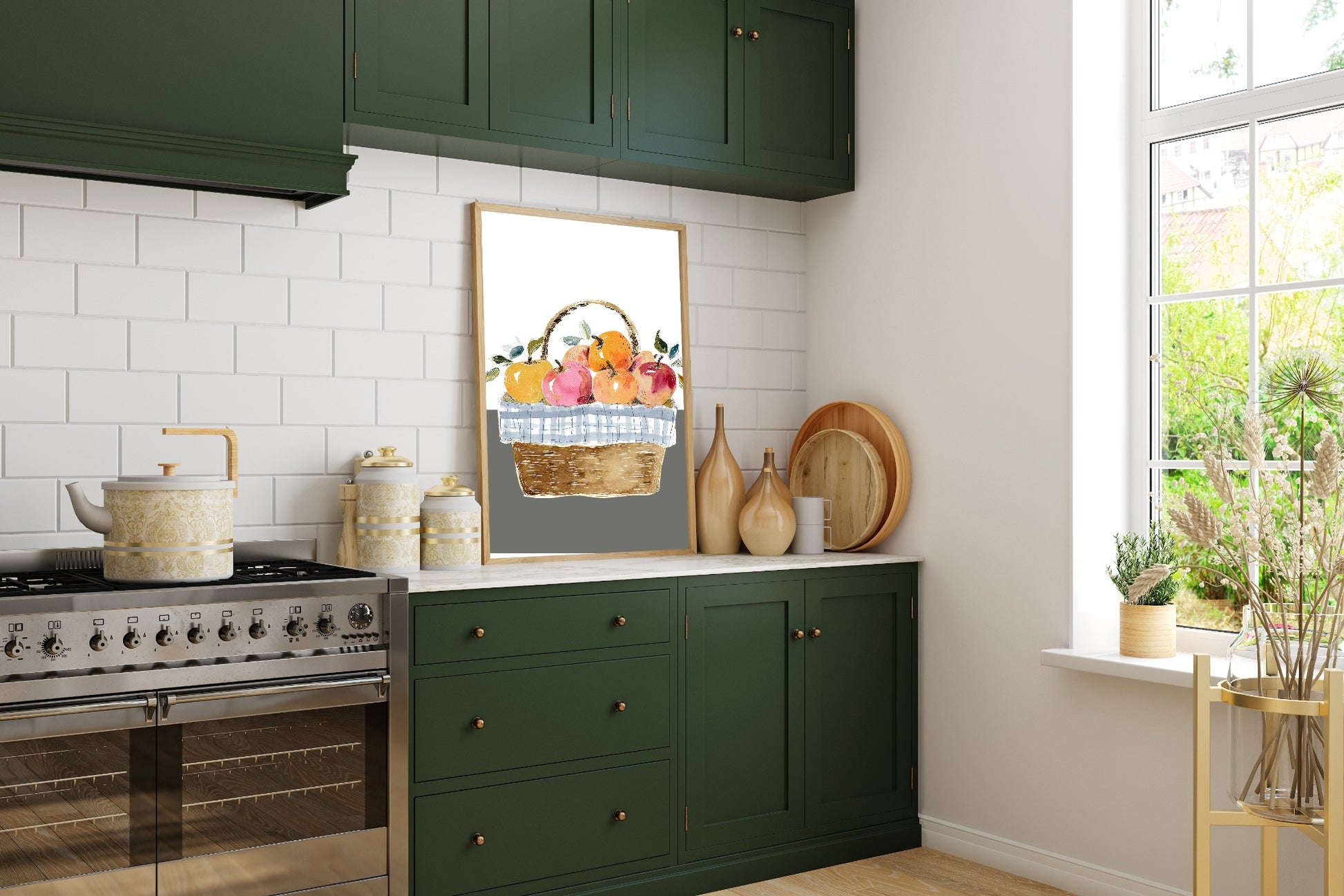 Bring a cosy, seasonal touch to your home with the Winter Apples Print, featuring a basket of fresh apples set against a subtle white and grey background. A charming design that adds warmth and rustic charm to kitchens, dining areas, or gallery walls.