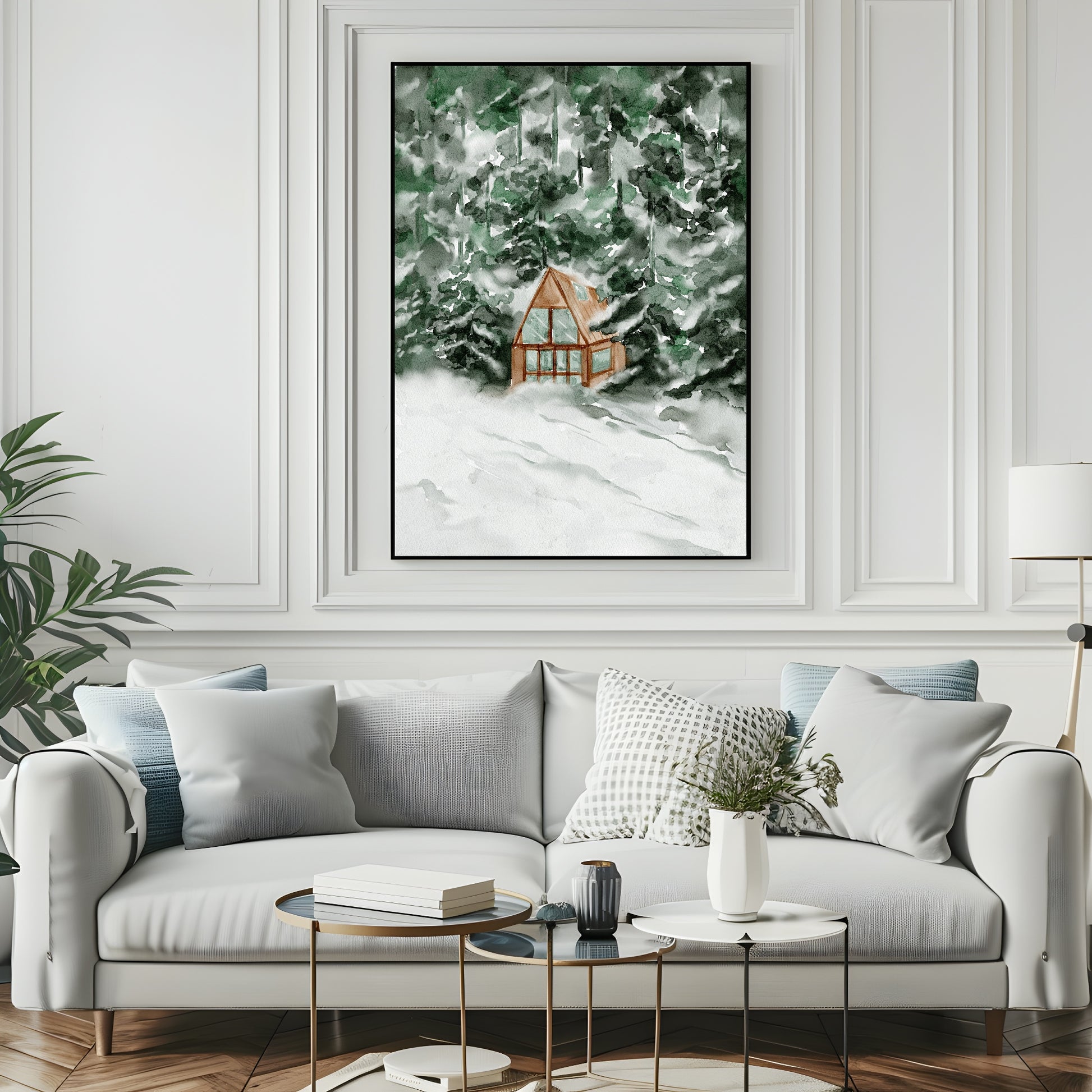 Bring the magic of winter into your home with this Winter Cabin Print, featuring a cosy cabin nestled among snowy trees and mountains. A serene design that captures the beauty of the season, perfect for adding warmth and charm to living rooms, bedrooms, or seasonal displays.