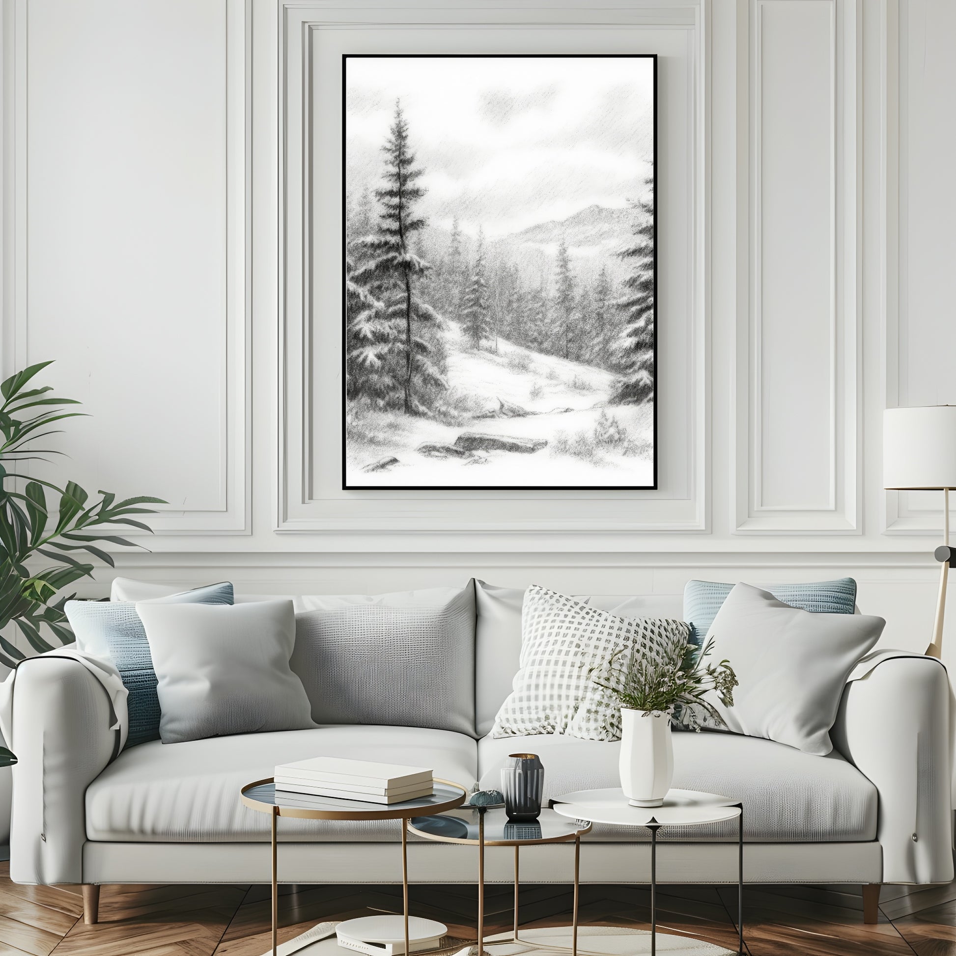 Capture the beauty of winter with this Winter Landscape Print, featuring snow-covered mountains and trees in a serene, frosty setting. A calming design that brings seasonal charm to any room, perfect for living rooms, bedrooms, or gallery walls.
