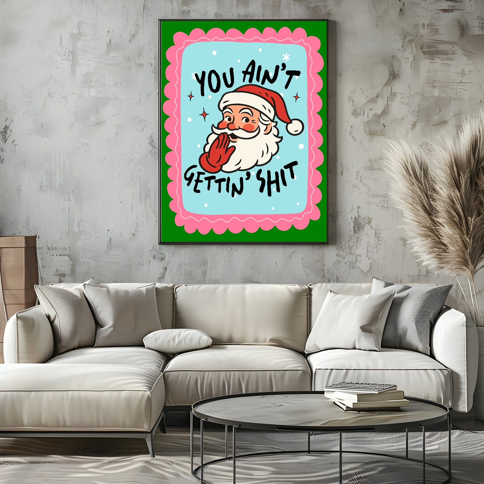 Bring humour and festive mischief to your home with the You Ain’t Gettin’ Shit print. Featuring a cheeky Santa illustration and a hilarious message, this artwork is perfect for anyone who loves a playful, irreverent twist on Christmas décor. Printed on premium 300gsm card and available in A5, A4 and A3 sizes, it offers excellent quality and a smooth, professional finish. Ideal for kitchens, living rooms, bedrooms, or as part of a fun festive gallery wall, this print adds personality, laughter, and holiday spirit to your home. Make your Christmas décor memorable with this bold and witty wall art.